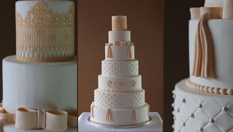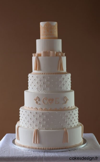 Un magnifique gâteau de sept étages orné de dentelle, de drapés et de nœuds pour émerveiller vos convives. Chaque étage est une surprise de saveurs.